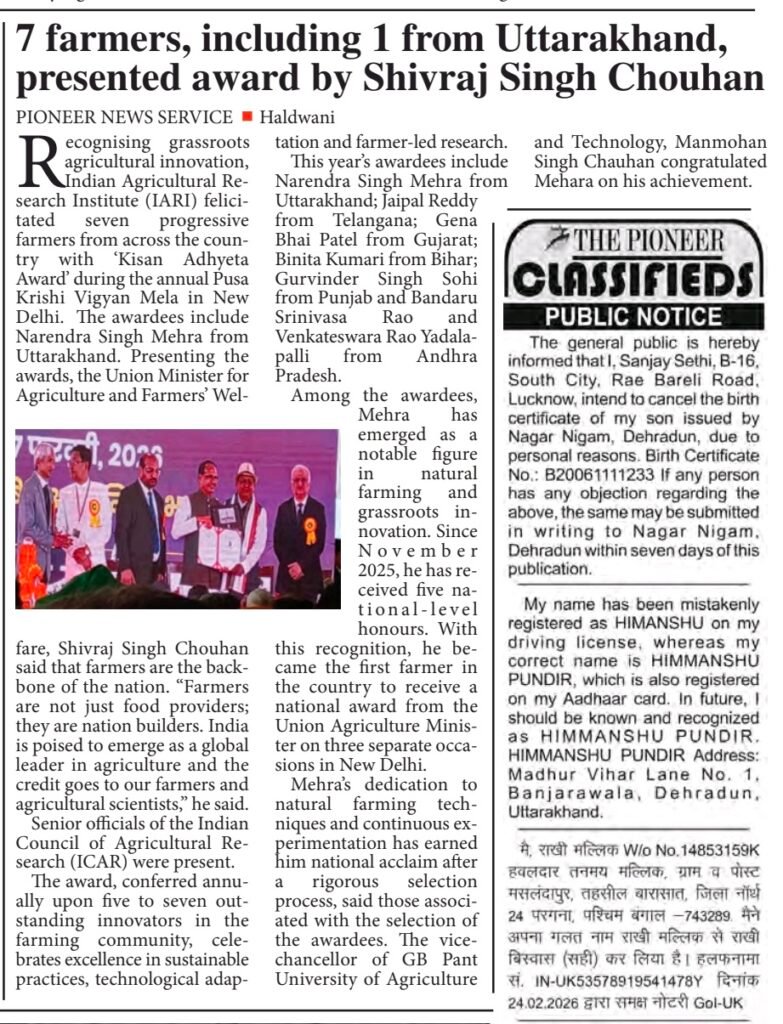 नई दिल्ली/हल्द्वानी। जमीनी स्तर पर कृषि नवाचार को राष्ट्रीय पहचान देते हुए Indian Agricultural Research Institute (आईएआरआई) ने नई दिल्ली में आयोजित वार्षिक Pusa Krishi Vigyan Mela के दौरान देशभर के सात प्रगतिशील किसानों को प्रतिष्ठित ‘किसान अध्येता पुरस्कार’ से सम्मानित किया।